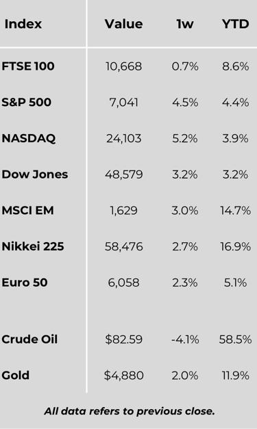 Global markets advanced over the week, supported by signs of de-escalation in the Middle East, resilient economic data, and a constructive start to the earnings season. Risk sentiment improved as energy supply concerns eased, helping to lift equities across major regions, with the United States leading gains. While inflation pressures showed tentative signs of moderation and growth remained broadly stable, underlying divergences persist – particularly between stronger industrial activity and weaker consumer and housing trends. Central banks maintained a cautious stance amid ongoing uncertainty, and although geopolitical risks have receded in the near term, markets remain sensitive to developments that could disrupt the current constructive backdrop.